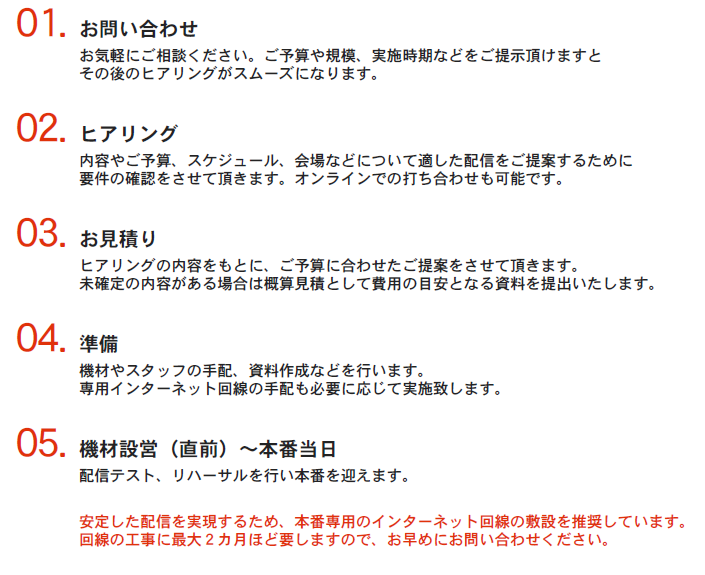 撮影、配信に加えてネットワーク回線の手配も承っております。まずはお気軽にご相談ください。