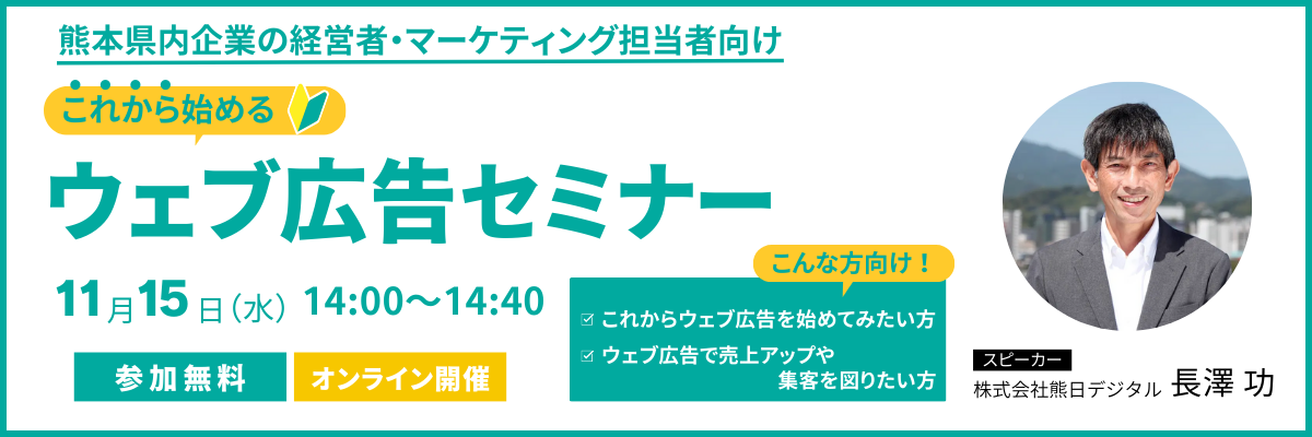 「ウェブ広告に関心はあるけれど何から始めたらいいか」悩まれている方に向けてオンラインセミナーを開催します。同じような悩みを持っていた熊日デジタルの代表が体験談や事例を交えてお話します。何も分からないという方でも基本からお伝えしますのでお気軽にご参加ください。