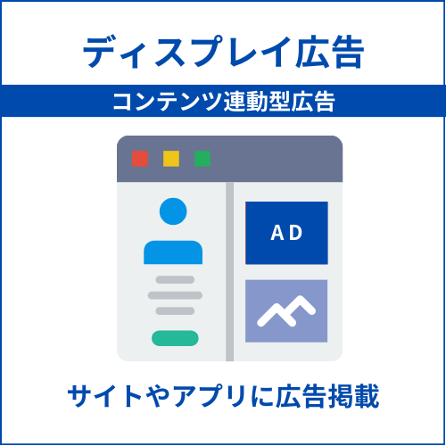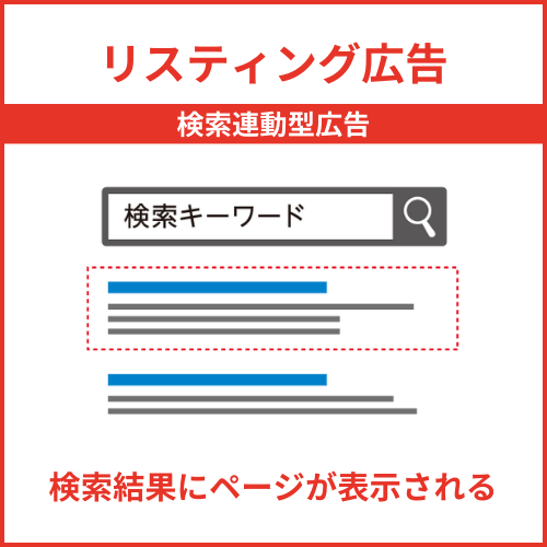 Google検索で指定したキーワードを検索した人に広告を表示します。キーワードを選んで出稿できるため、見込みの高いユーザーに配信することができます。また、SEOと違い、すぐに検索結果の上部等に表示することができるため即効性が高く、早く集客をしたい場合に向いています