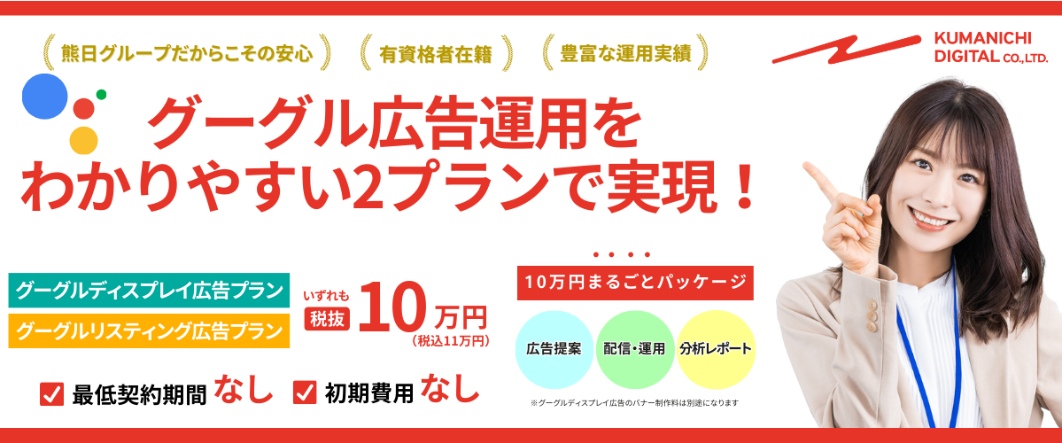 当社のグーグル広告運用代行プランは、「リスティング広告プラン」と「ディスプレイ広告プラン」のシンプルな2プランで、どちらも10万円(税込11万円)でご利用いただける安心の定額プランです。広告運用に関する不安を解消し、スムーズな広告キャンペーンを展開できます。